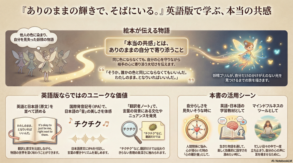 「誰かの色にならなくてもいい」というメッセージを、英語の表現で読むことで、自分との距離感や、人との距離感を別の角度から感じることができます。 - やさしい英語表現で、学び直しに